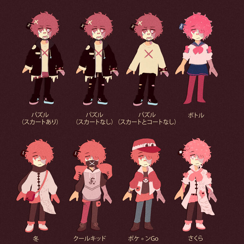 These aren't every single Fukase I've ever designed but this is most of them. Other designs that are okay to use are my Bakery Fukase, Yukata Fukase, Japanese style Fukases, Heart-broken Fukase, Hajimari Fukase--if you come across any more, just make sure it's actually a design I made! I usually make it clear if it isn't (If it's not my design, I usually write it in the description. If there's no disclaimer, it's an original outfit)Top row: Puzzle (With Skirt), Puzzle (No Skirt), Puzzle (Without skirt or coat), Bottle