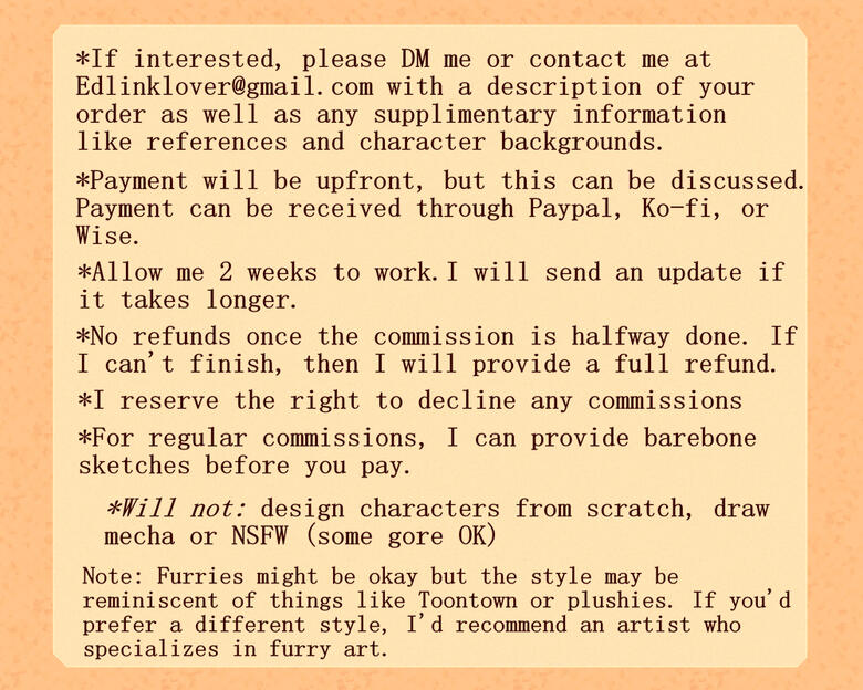 [If interested in commissions please either DM me on my Twitter, Tumblr, or Instagram (those have the fastest responses and are all Edlinklover) or email me at [email protected]! If you just want a Ko-fi commission, it's in my links! (I'm Edlinklover on Ko-fi!)